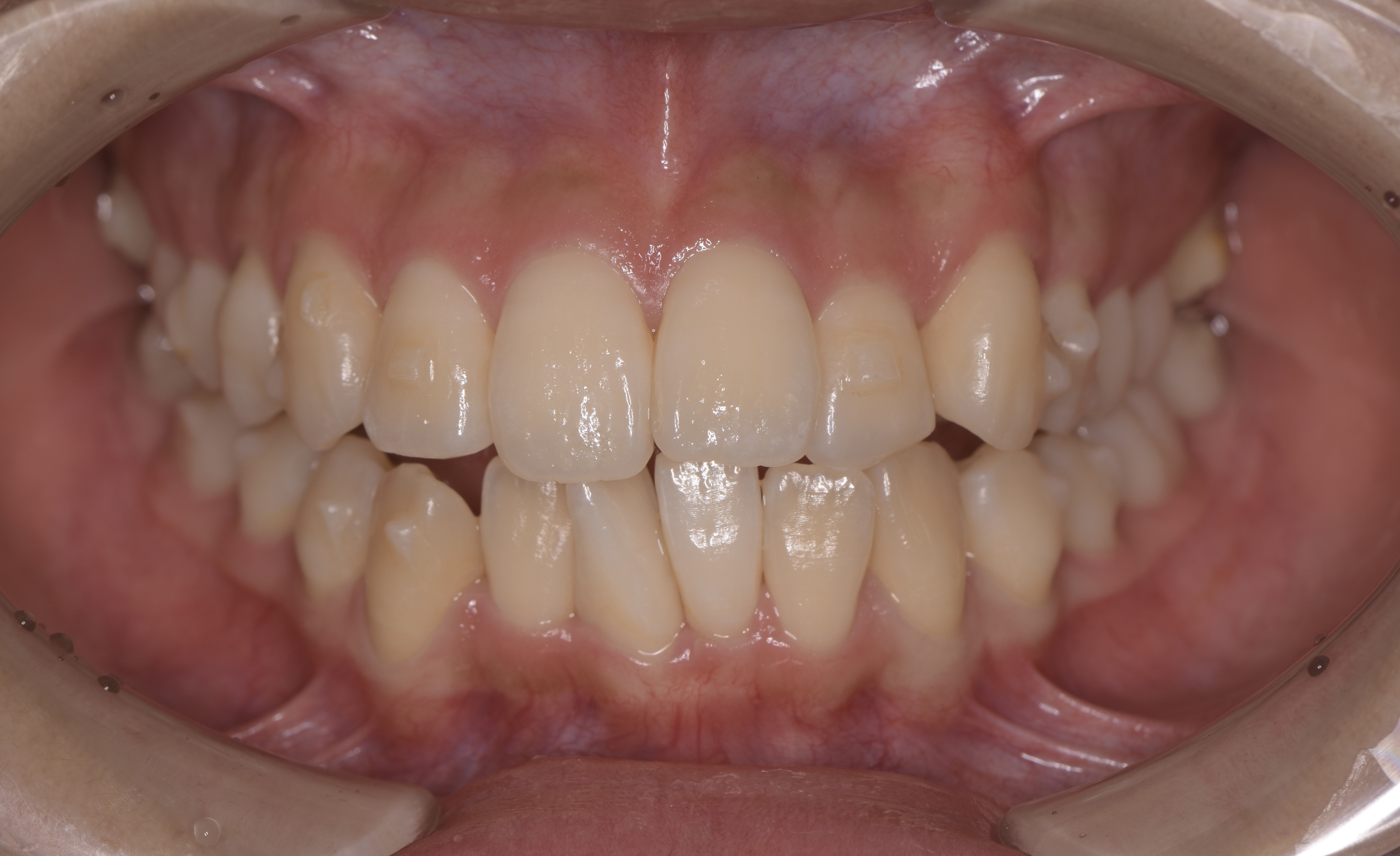 顎に歯が並ぶスペースが足りないことによって、特に上顎左2番の低位口蓋側転位と、下顎左1番の捻転が目立ちます。これにより前歯部叢生を伴った上顎前突と言われる状態で、不正咬合による顎関節への負担が主訴となっている顎の痛みに繋がっているものと考えられます。ただし目立つ虫歯(カリエス)もなく、健康な歯と歯ぐきを保ってらっしゃるデンタルIQの高い患者さんということがわかります。