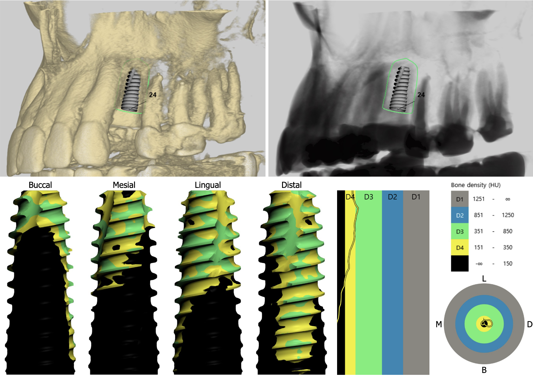 この「T-scan」はインプラント治療にも応用できる点が他の計測装置との違いの一つです。「I-24」と表示されているのはインプラントが埋入されている表記で、そこに他の歯と同じ力が掛かっている事を示しています。これは通常のリボン紙(咬合紙)では全くわかりません。このように天然歯、補綴歯、インプラント治療歯の力の違いを把握すれば、インプラントに掛かる力による治療後のトラブルを回避出来ると考えます。